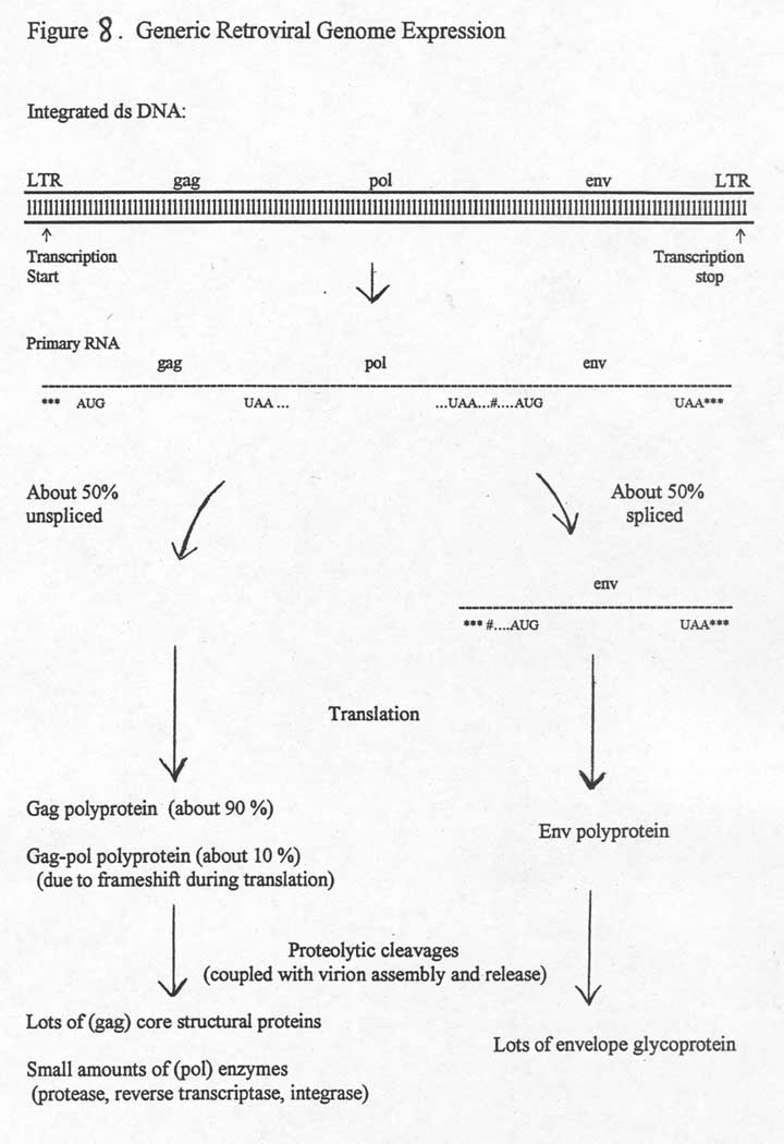 Note that if RNA splicing did not occur for some fraction of the transcripts, there would be no way to express the env gene. It is only via splicing that the AUG translational start codon at the beginning of env ever gets "seen" as a start codon by ribosomes. Also, if ribosomal frameshifting did not occur at least once in a while during the translation of the full length transcripts, no pol proteins would ever get made. So, it is very clear that both of these "partial processes" (splicing some but not all of the transcripts, and ribosomal frameshifting during a few, but not most, of the passages of ribosomes down the full length transcript) are not mistakes, but rather part of the evolved pattern of expression of retrovirus genomes. The signals for these partial processes are somehow there in the nucleotide sequence.