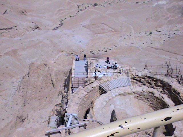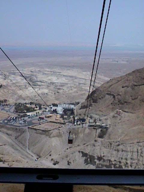 OK, enough talk, more pictures! Yes, we did go swimming (or rather, floating) in the Dead Sea, but my one digital picture is a bit blurry, so maybe we'll go back -- Adam and Abigail loved it! We also went to Massada, (the palace that Herod constructed in the mountains looks down at the lower palace from the upper one -- I can't make out Adam and Pamela down there, can you?) looking down on the Dead Sea. Here the last of the Jewish zealots resisted the Roman legions. Young soldiers in the Isreali Defense Forces still come here and say, "Masada will never fall again!" We rode up in a cable car -- below us is one of the Roman seige camps, next to the bottom of the cable. One of the recent finds at Massada was a synogogue, with scrolls similar to those found at Qumran, a score or miles to the north, which suggests that the Essene community were not entirely pacifist in the struggle with the Romans.