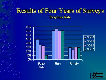 The response rate in the first year was fairly good since these were volunteers in a special residential living unit. The next two years we had a response rate of over 30% which was what we were shooting for. Last year our rate was only 10% due mainly to the timing of the survey. We did however get a total of 169 responses and looking at the results as a whole they do not seem out of line with the results from previous years. As you can see the ratio of males to females remains about the same and indicates that more male bring computers than females which has also been seen in our yearly survey of incoming freshmen (should I say fresh students).