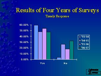 Comments on surveys indicated that this was due largely to lack of responsiveness during the first three weeks of the semester. Responsiveness was also poorer during the transition years of ‘94 - ‘95 when we first distributed Windows 3.1 and last year when we first distributed Windows 95.
